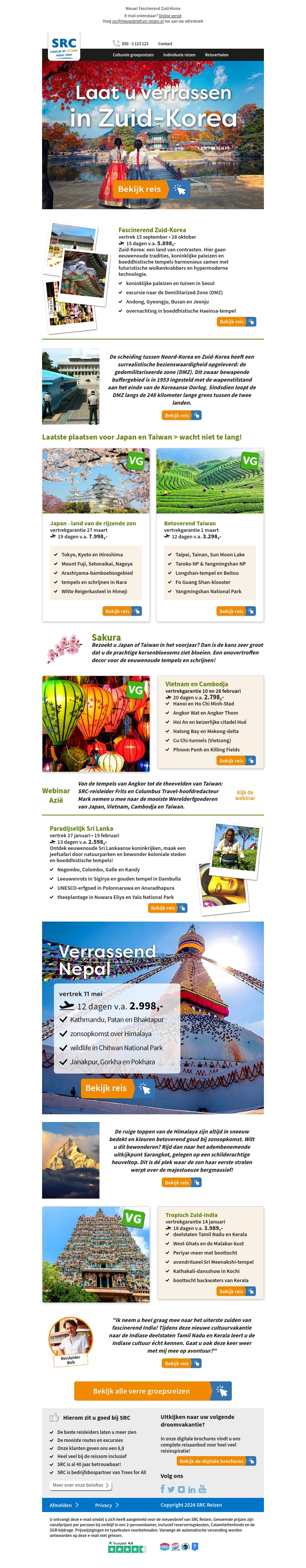 Ontdek de magie van Azië met SRC Reizen: van Zuid-Korea tot Vietnam, er staat een wereld aan ervaringen op je te wachten. Bezoek indrukwekkende tempels, verken historische steden en laat je meevoeren langs schilderachtige landschappen. Grijp de kans om te genieten van culturele avonturen door landen als Japan, Taiwan en India. Of je nu houdt van natuur, geschiedenis of culinaire hoogstandjes, er is voor ieder wat wils.