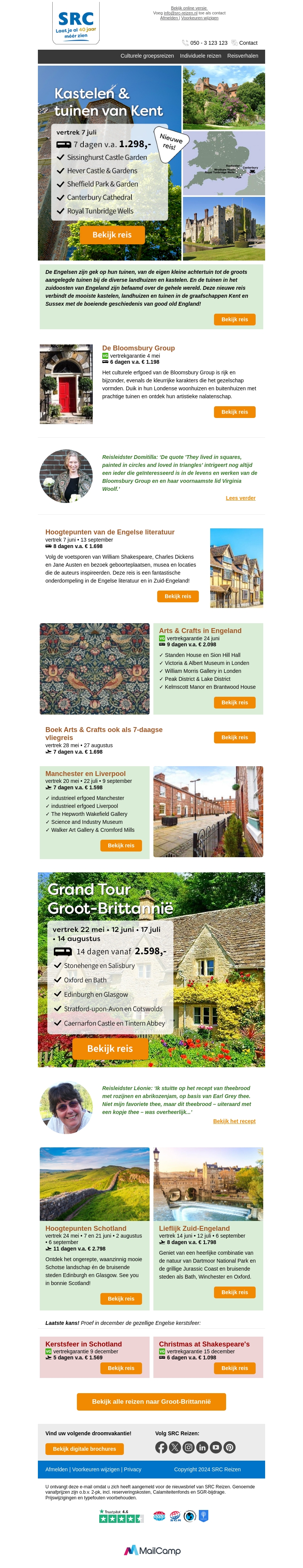 Deze nieuwsbrief nodigt je uit voor een ontdekkingstocht door Groot-Brittannië, met bijzondere reizen naar de kastelen en tuinen van Kent. Daarnaast wachten literaire highlights op je in Engeland, inclusief de werelden van Shakespeare en Dickens. Profiteer van speciale aanbiedingen op culturele rondreizen. Boek snel je volgende avontuur.