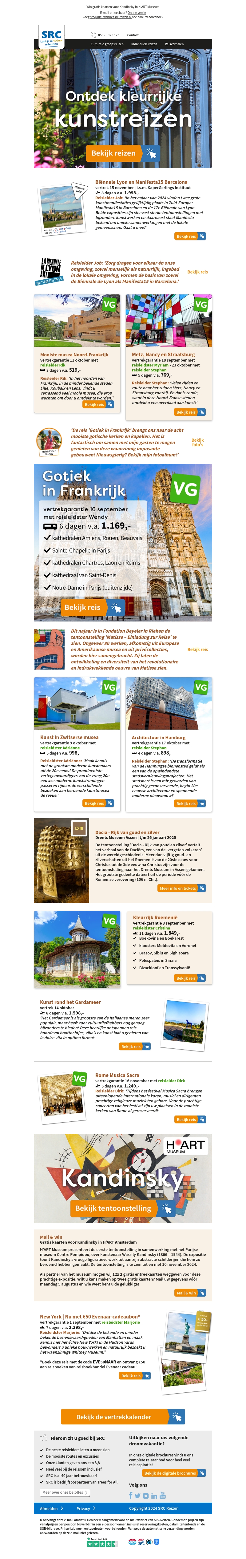 Beleef culturele kunstreizen naar prachtige bestemmingen zoals Lyon, Roemenië en de Gardameer. Ontdek gotische schoonheid in Frankrijk en moderne kunst in Zwitserse musea. Mis de kans niet op exclusieve tentoonstellingen, waaronder Kandinsky in het Kröller-Müller Museum. Grijp nu je vakantie met een speciale korting!