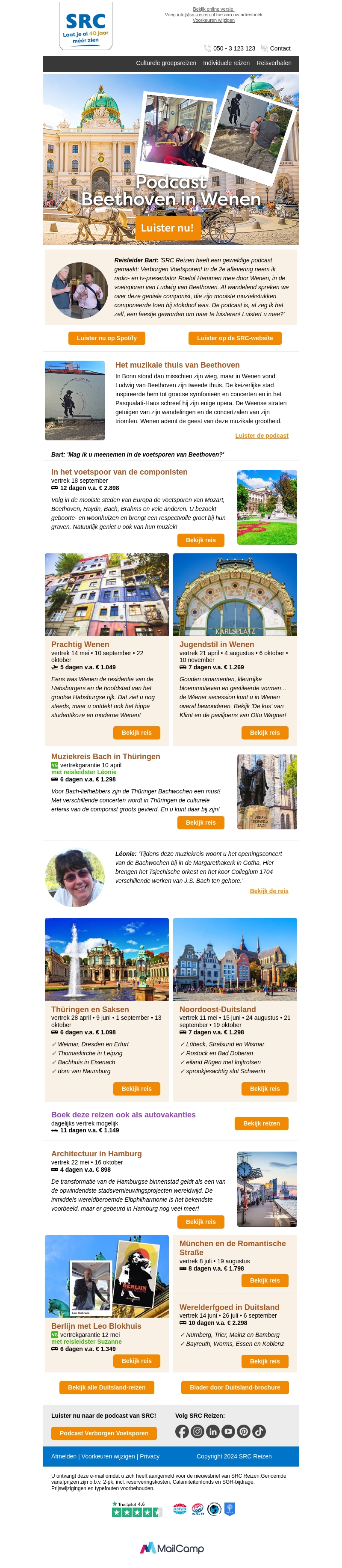 SRC Reizen presenteert 'Podcast Verborgen Voetsporen', waarin de luisteraar het Wenen van Ludwig van Beethoven ontdekt. De podcast biedt boeiende verhalen en muzikale hoogtepunten uit het leven van de componist. Bijpassende reizen naar Wenen brengen je langs historische locaties gerelateerd aan Mozart en andere grootheden. Ervaar het culturele erfgoed tijdens een van de uitgestippelde reizen. Boek nu en dompel jezelf onder in de muzikale geest van Wenen.
