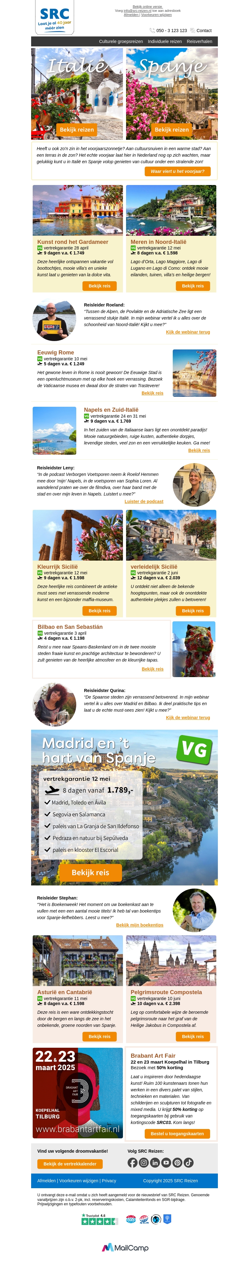 Welkom bij onze inspirerende nieuwsbrief vol reisavonturen voor de lente! Verken het prachtige Italië en Spanje terwijl je cultuur, kunst en de schoonheid van de natuur ontdekt. Met gegarandeerde vertrekdata en deskundige reisleiders, beleef unieke momenten deze lente. Mis niet onze exclusieve aanbiedingen en plan je ideale vakantie nu.