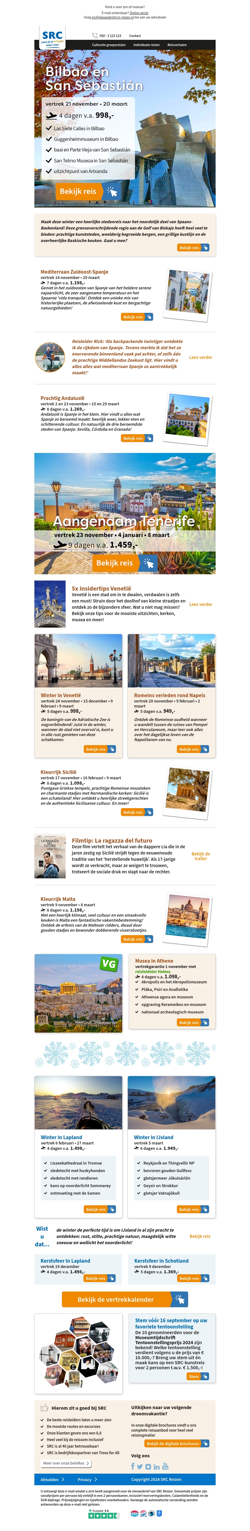 Ontdek de charme van Bilbao en San Sebastián, geniet van de Mediterrane pracht in Zuid-Spanje, of reis naar het betoverende Lapland voor een echte winterervaring. Of het nu gaat om winterzon in Andalusië of cultuur in Venetië, deze nieuwsbrief biedt de perfecte wintervakantie.
