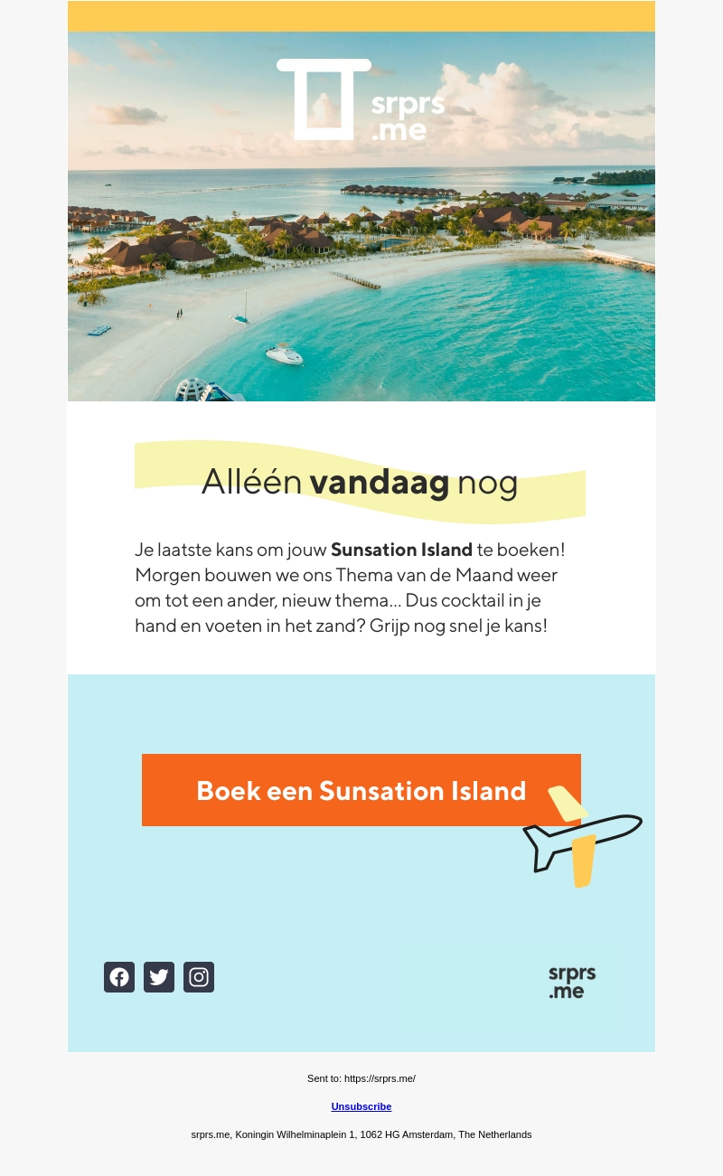 Grijp je kans om Sunsation Island te boeken, alleen vandaag nog! Morgen wordt het thema veranderd, dus geniet van een cocktail in de zon met je voeten in het zand. Pak deze laatste kans nu!