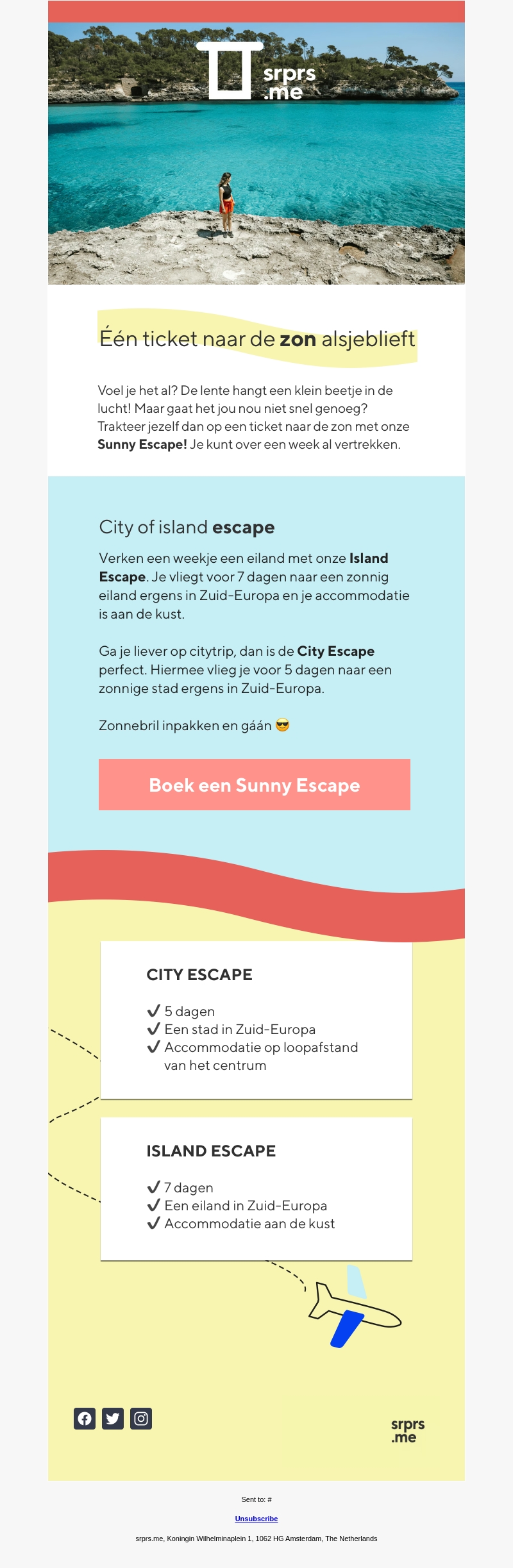 Ben je toe aan wat zonneschijn? Met de Sunny Escape kun je een heerlijke vakantie boeken naar een zonnig eiland of stad in Zuid-Europa. Kies een City Escape voor 5 dagen stedelijk avontuur of ga voor een Island Escape van 7 dagen aan de kust. Genieten van de zon is nog maar een boeking verwijderd!