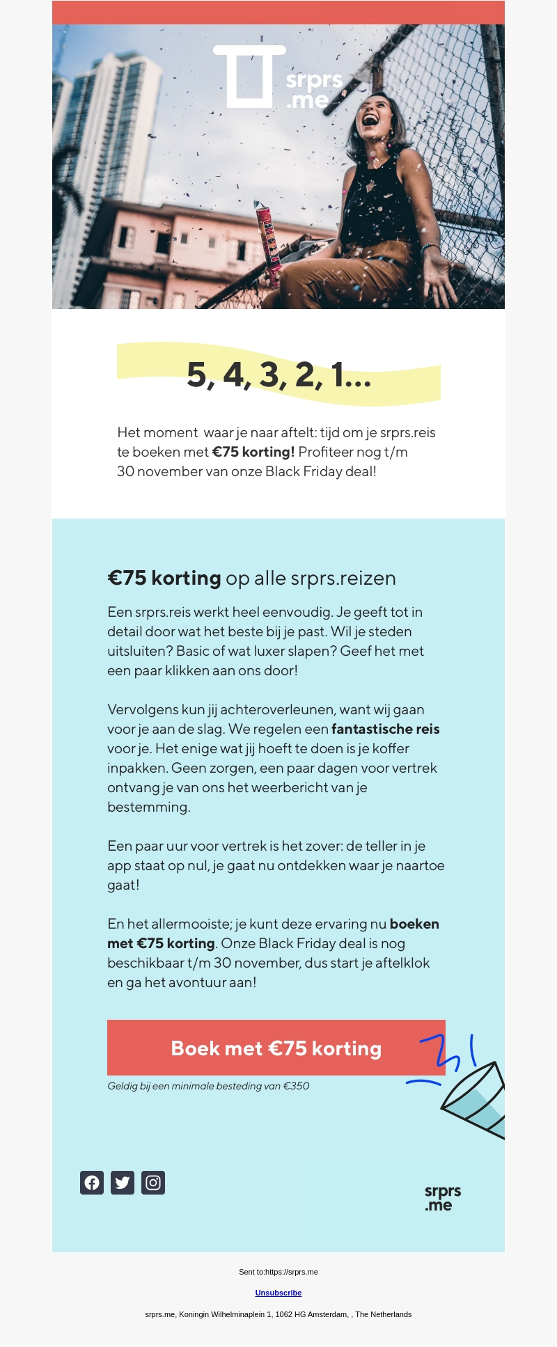 Beleef een verrassende citytrip met srprs.me en ontvang €75 korting tijdens onze Black Friday deals. Ontsnap aan de dagelijkse sleur en laat je verrassen door een avontuurlijke reis. Boek voor 30 november en start je avontuur met een geweldige korting.