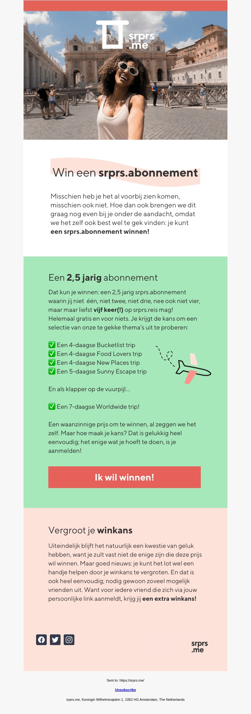 Heb je deze kans al zien voorbij komen? Met een 2,5-jarig srprs.abonnement maak je kans op maar liefst vijf geweldige reizen! Ontdek de wereld met unieke thema's zoals de Bucketlist trip, Food Lovers trip en meer. Lees verder om te zien hoe je eenvoudig kunt deelnemen en je winkans kunt vergroten.