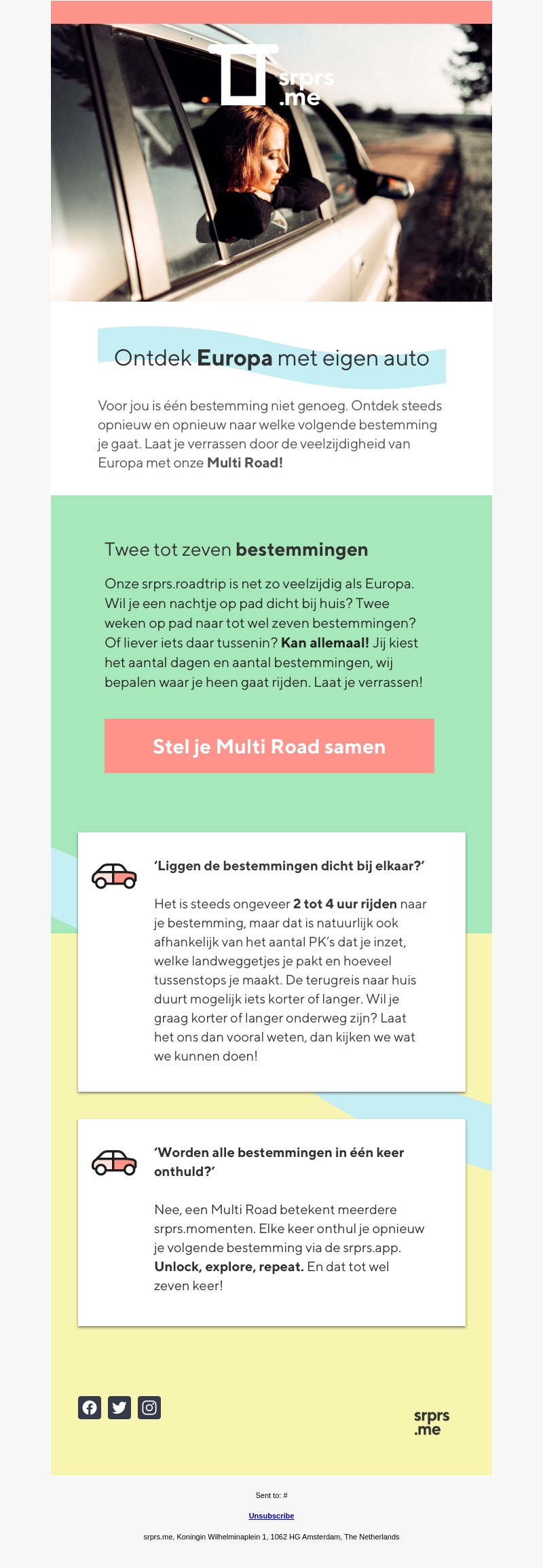 Ga op avontuur en ontdek Europa met je eigen auto via de Multi Road van srprs.me. Ervaar tot wel zeven verrassende bestemmingen tijdens je reis. Jij bepaalt het aantal dagen, wij verrassen je met de bestemmingen. Laat de reis vol verrassingen beginnen!