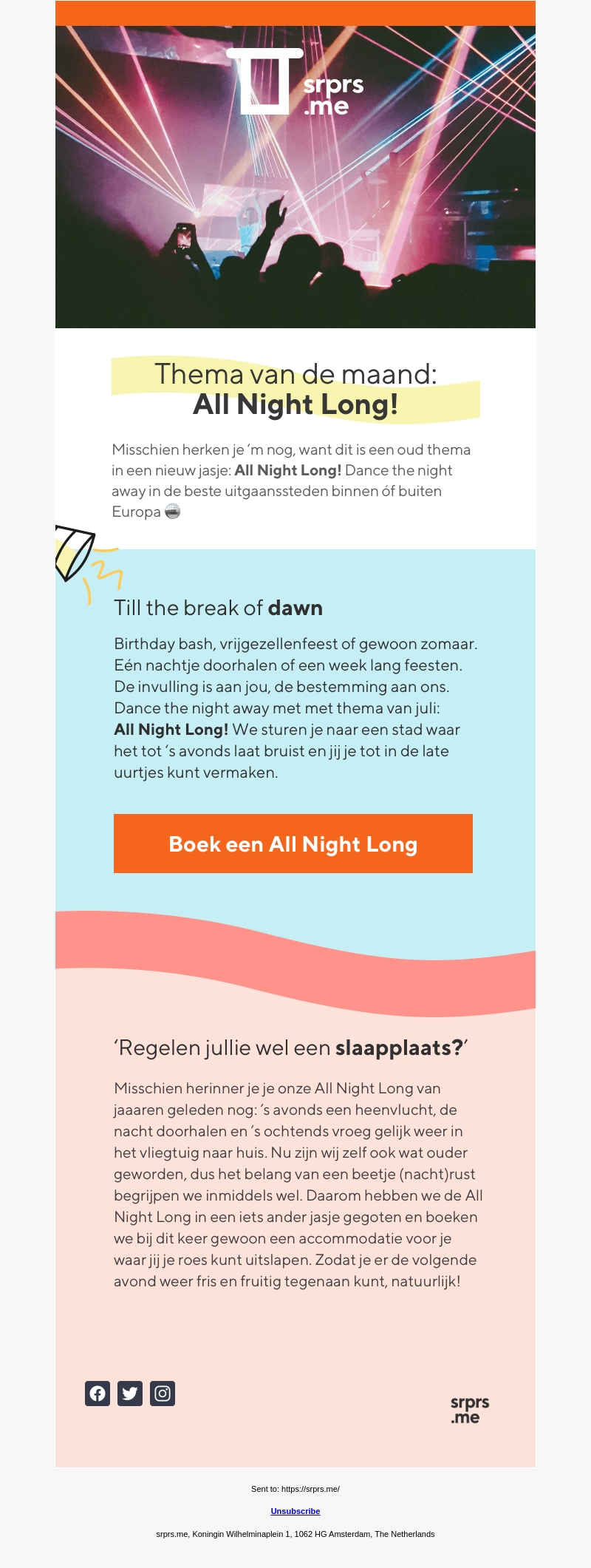 Misschien herken je 'm nog van vroeger: All Night Long! Dit is een vernieuwd thema waarbij je de hele nacht kunt dansen in de beste uitgaanssteden, binnen of buiten Europa. Boek nu een onvergetelijk feest en geniet van een nacht vol plezier en avontuur.