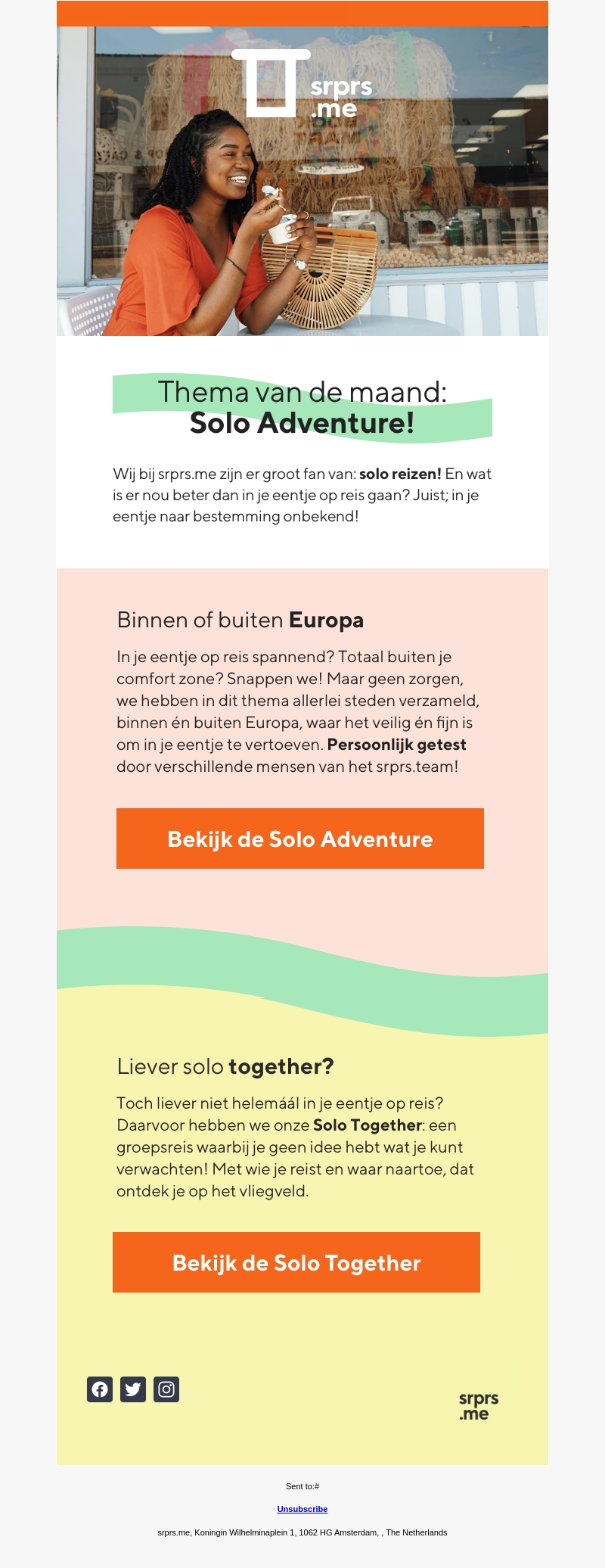 Start je eigen solo avontuur in onbekende steden. Met srprs.me ben je verzekerd van een veilige en spannende reis binnen of buiten Europa. Voor degenen die liever samen reizen, biedt onze 'Solo Together' ervaring een verrassend groepsreisavontuur.