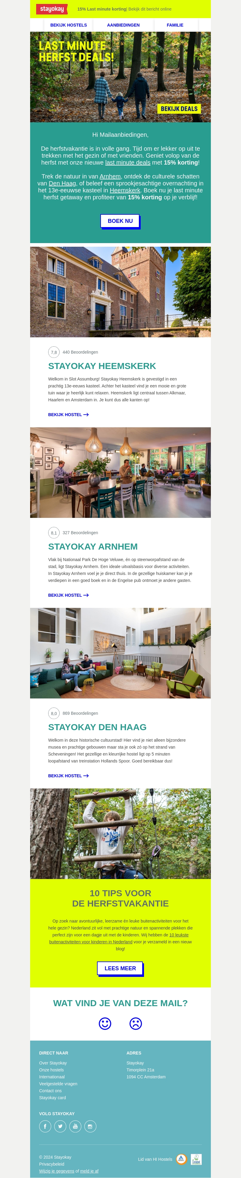 Duik de herfst in met Stayokay's last minute deals! Bezoek schitterende plekken zoals Heemskerk, Arnhem en Den Haag met 15% korting. Ontsnap naar de natuur of verken culturele schatten met het hele gezin. Boek nu jouw onvergetelijke vakantie!