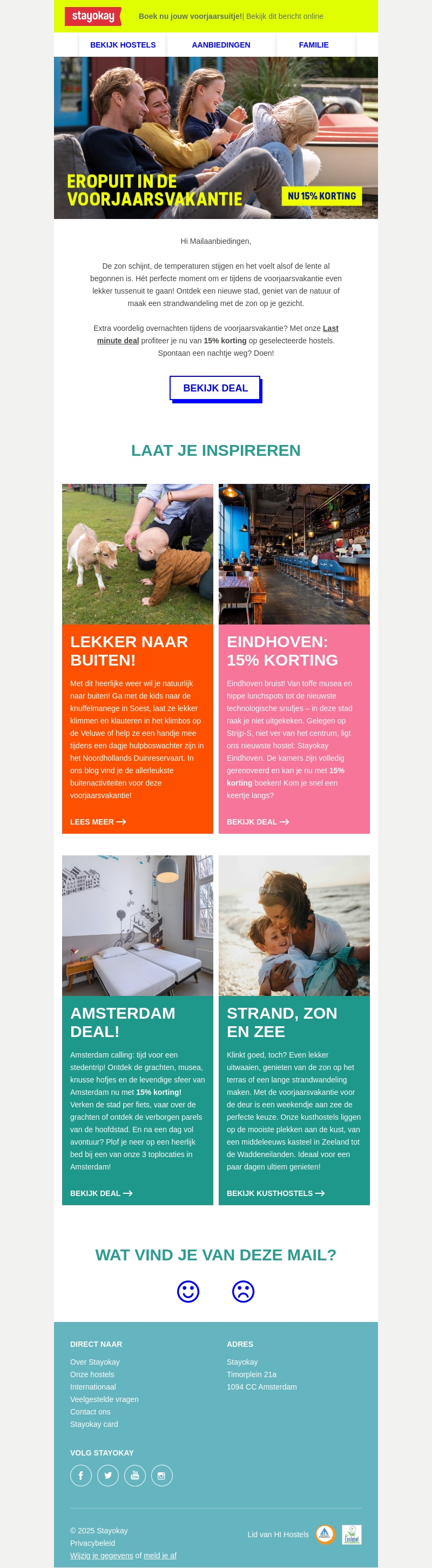 De voorjaarsvakantie is de perfecte tijd voor een leuke uitje met Stayokay. Profiteer van 15% korting op geselecteerde hostels en ontdek inspirerende bestemmingen zoals Eindhoven en Amsterdam. Geniet van prachtige buitenavonturen of relax aan het strand. Laat je inspireren door onze exclusieve deals.