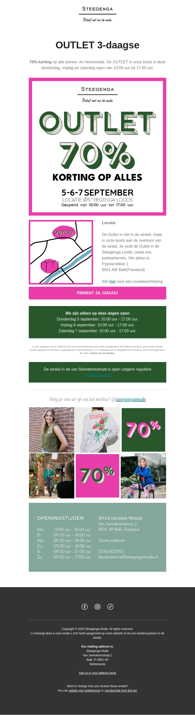 Ontdek de 70% korting in de Steegenga Mode OUTLET. Drie dagen lang winkelplezier van 5 tot 7 september. Bezoek ons in Balk voor de beste deals op dames- en herenmode. Mis het niet!