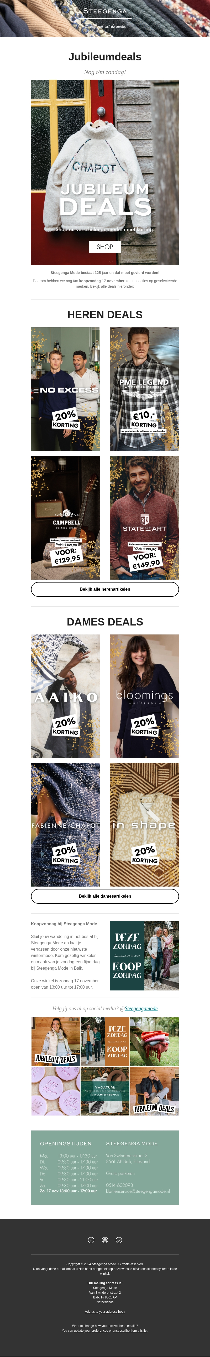 Vier het jubileum van Steegenga Mode met fantastische aanbiedingen. Voor heren schitteren merken als No Excess en PME Legend met kortingen tot 20%. Dames kunnen genieten van merken als Aaiko en Bloomings, ook met aantrekkelijke kortingen. Bezoek de winkel of shop online en profiteer van deze unieke deals. Wees er snel bij, want alleen deze week geldig. Tot slot, onze speciale koopzondag niet te vergeten!