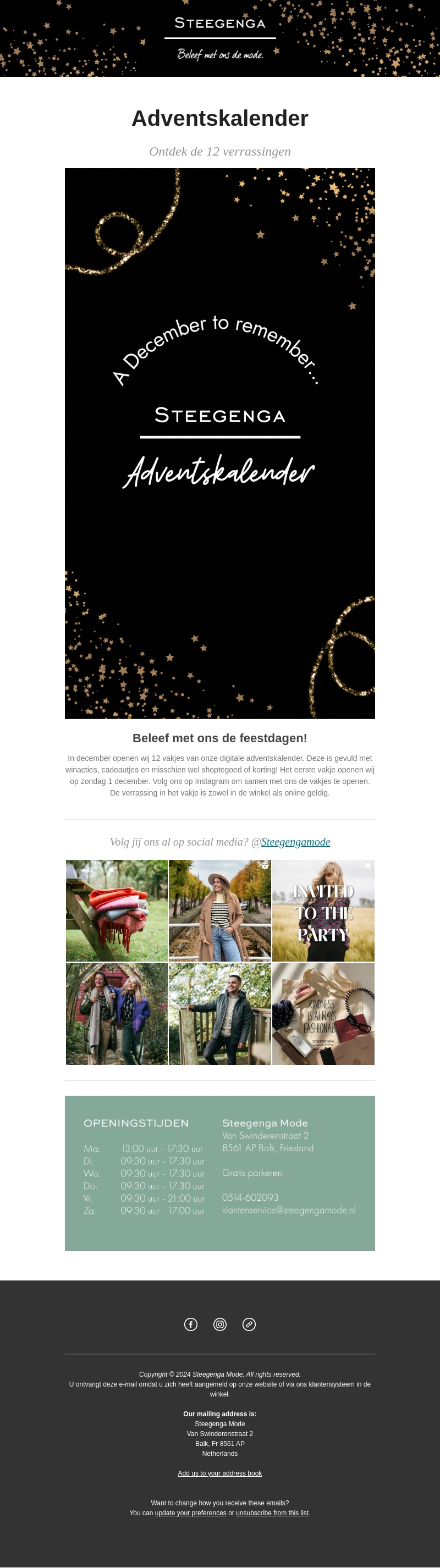 Ontdek de magie van de feestdagen met de Steegenga Mode Adventskalender. In december openen we elke dag een verrassend vakje vol winacties, cadeautjes en kortingen. Doe mee en geniet van dagelijkse verrassingen! Mis de feestelijke magie niet en volg ons op Instagram.