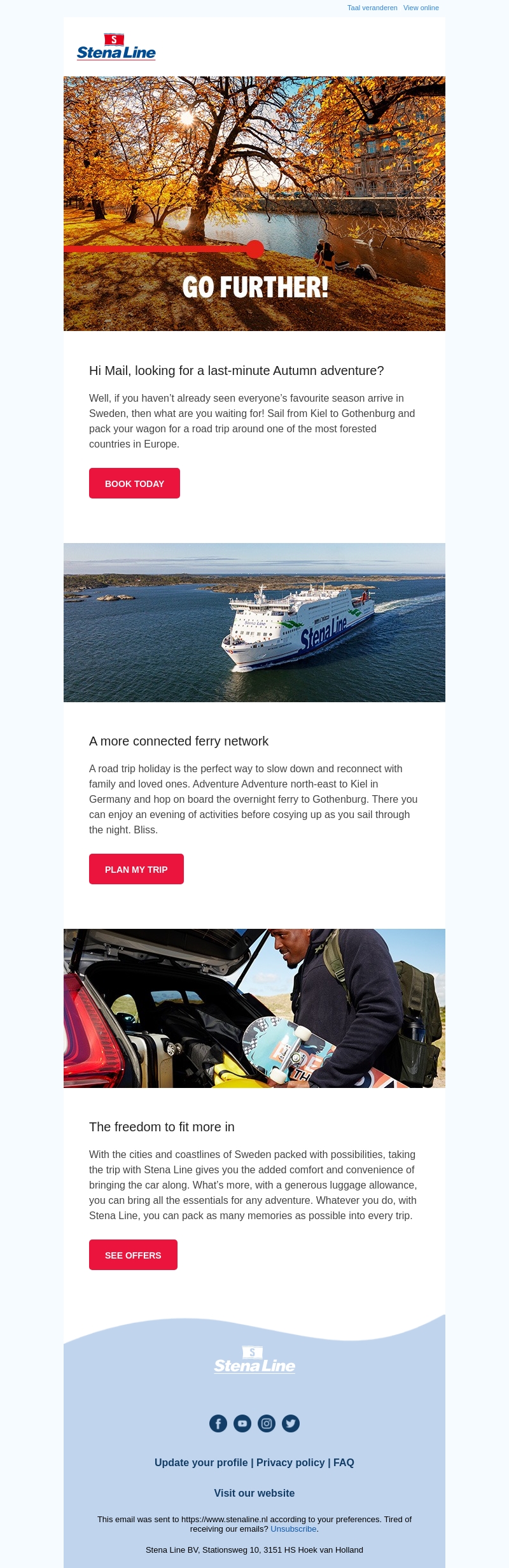Ervaar de magie van de herfst in Zweden met Stena Line. Geniet van adembenemende boswandelingen en kleurrijke landschappen. Met handige veerverbindingen is het gemakkelijk om Zweden te verkennen. Neem je auto mee en beleef een avontuur vol comfort en gemak. Verken het noorden van Duitsland en vaar over naar Göteborg. Ontdek alles wat je nodig hebt voor een onvergetelijke reis.