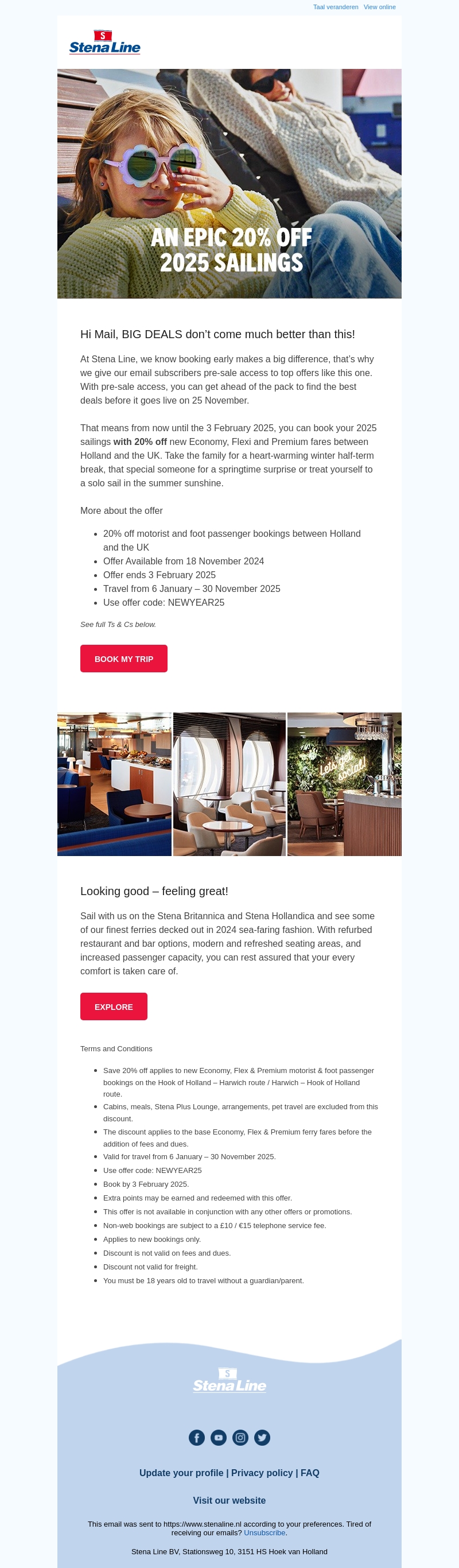 Boek je reis naar Engeland met Stena Line en ontvang een exclusieve 20% korting op 2025 zeilingen. Deze aanbieding geldt voor nieuwe Economy, Flexi en Premium tarieven tussen Nederland en het Verenigd Koninkrijk. De voorverkoop loopt van 18 november 2024 tot en met 3 februari 2025, voor reizen van 6 januari tot 30 november 2025. Gebruik de code NEWYEAR25 voor je korting.