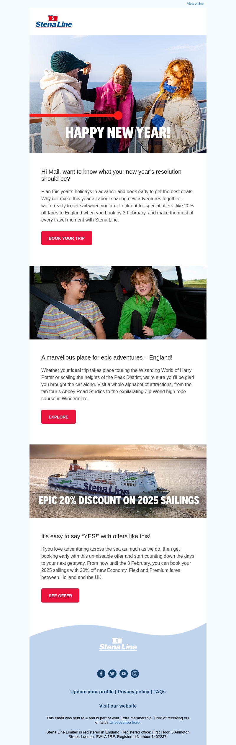 Gelukkig Nieuwjaar! Begin je jaar vol avontuur met Stena Line. Boek je reis naar Engeland en profiteer van 20% korting op 2025 afvaarten. Ontdek magische plaatsen zoals de Wizarding World of Harry Potter. Boek voor 3 februari en krijg de beste deals voor een onvergetelijke ervaring.