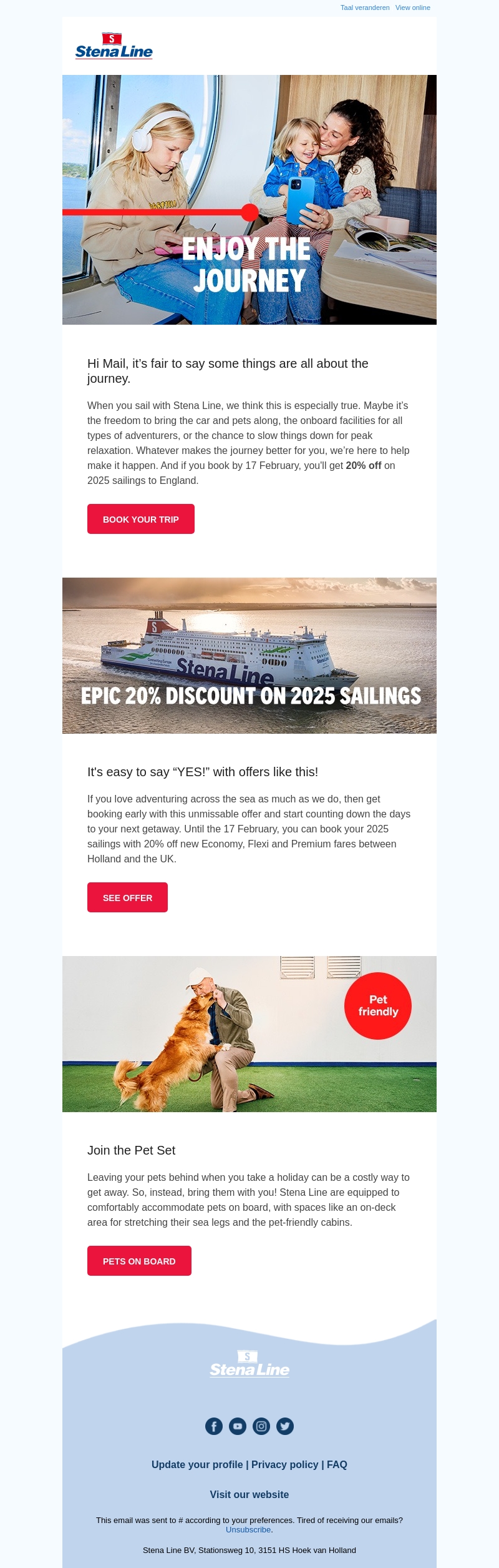 Reis voordelig met Stena Line en ontdek de vrijheid van het meenemen van uw auto en huisdieren. Geniet van ongeëvenaarde faciliteiten aan boord. Boek voor 17 februari en ontvang 20% korting op afvaarten in 2025 naar Engeland. Mis deze kans niet en plan uw volgende avontuur.