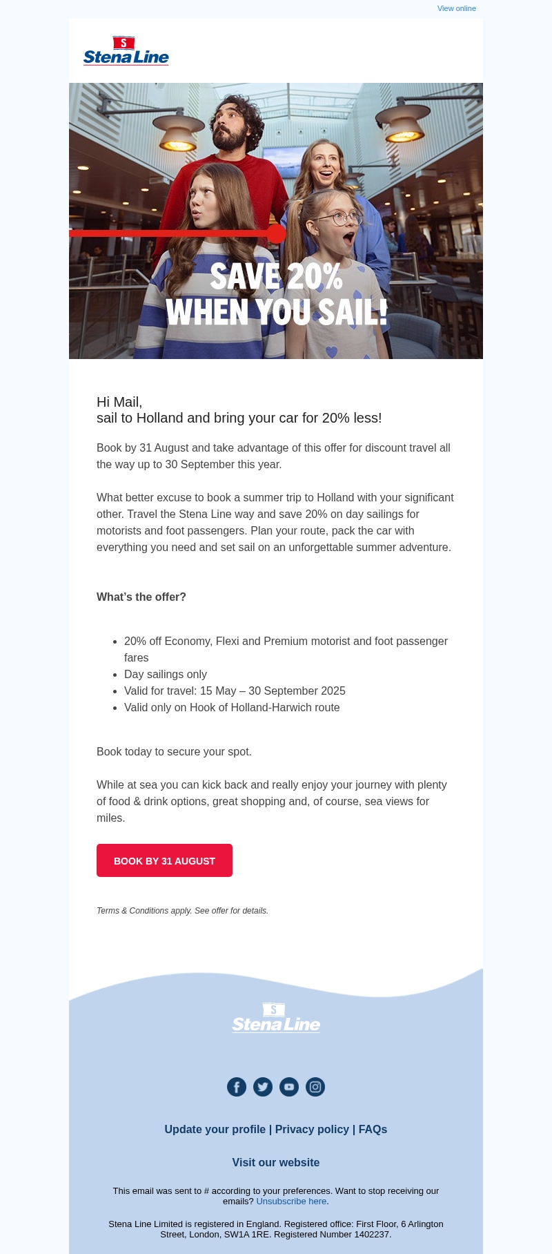 Save 20% when you sail - Head to the Netherlands for Less!