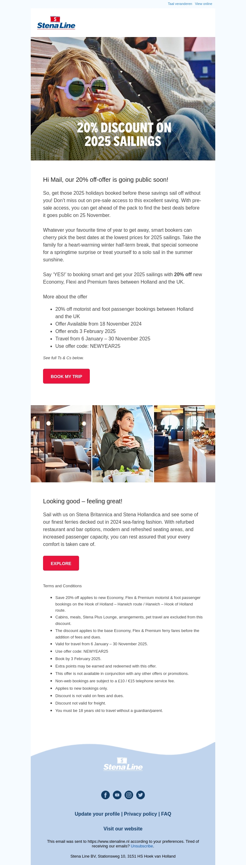 Mis deze unieke pre-sale kans niet om uw vakantie voor 2025 voordelig te boeken. Krijg 20% korting op nieuwe Economy, Flexi en Premium tarieven voor reizen tussen Holland en het Verenigd Koninkrijk. De aanbieding loopt van 18 november 2024 tot 3 februari 2025. Boek nu en reis tussen 6 januari en 30 november 2025 met de code NEWYEAR25.