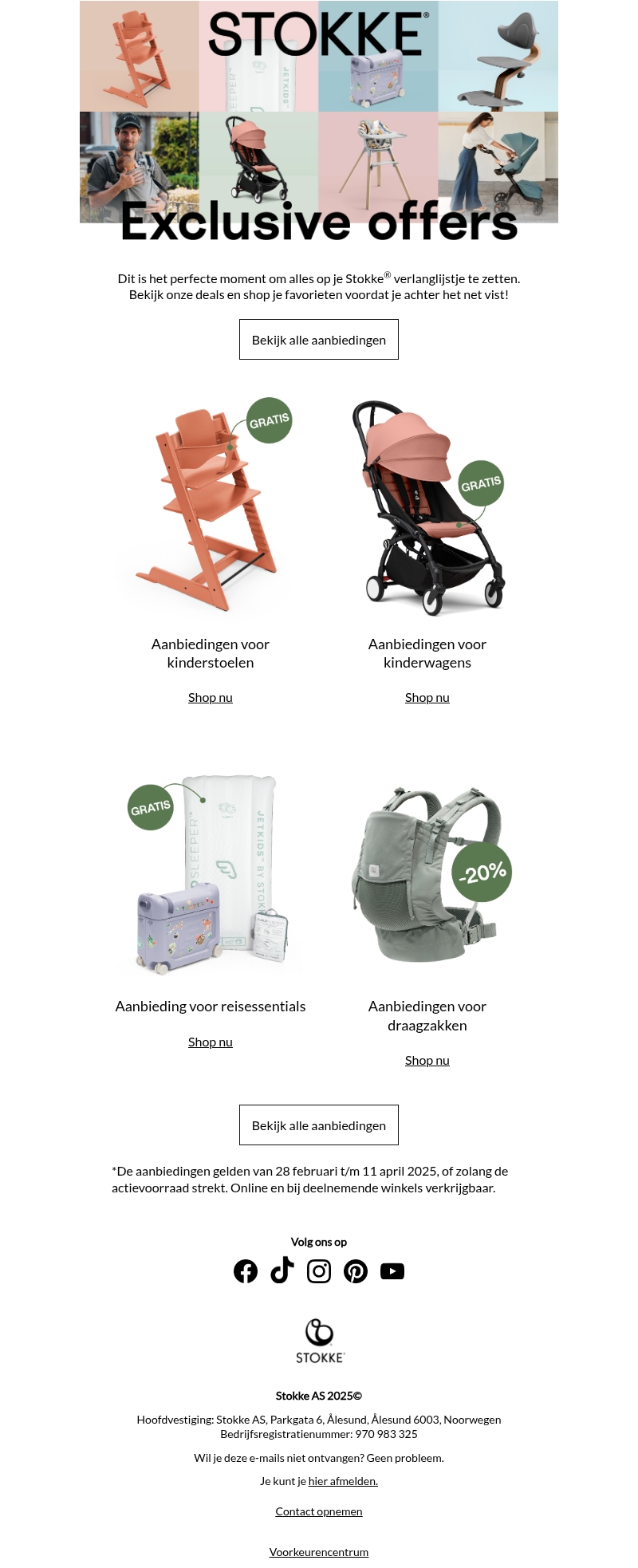 Stokke biedt exclusieve lente-aanbiedingen op een reeks van hun hoogwaardige producten. Van kinderstoelen tot kinderwagens en reissentials, je vindt gegarandeerd iets dat perfect is voor je gezin. Bekijk de deals en shop je favorieten voordat ze weg zijn! Deze aanbiedingen zijn geldig van 28 februari tot 11 april 2025.