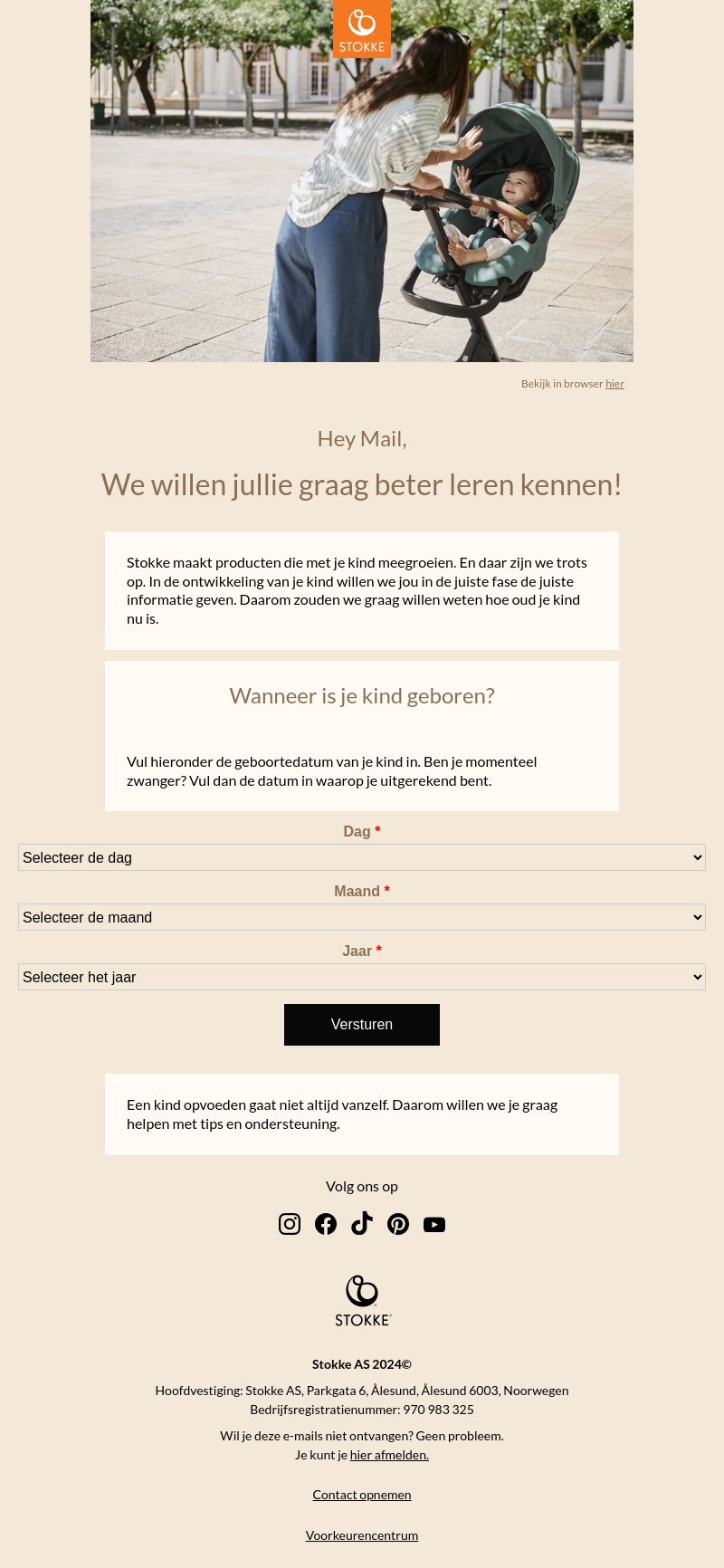 Stokke nodigt je uit om meer te vertellen over jou en je kind. Wij willen begrijpen hoe we jouw opvoedingservaring kunnen ondersteunen met onze producten. Vul de geboortedatum van je kind of je uitgerekende datum in als je zwanger bent. Samen maken we het ouderschap gemakkelijker met handige tips en adviezen.