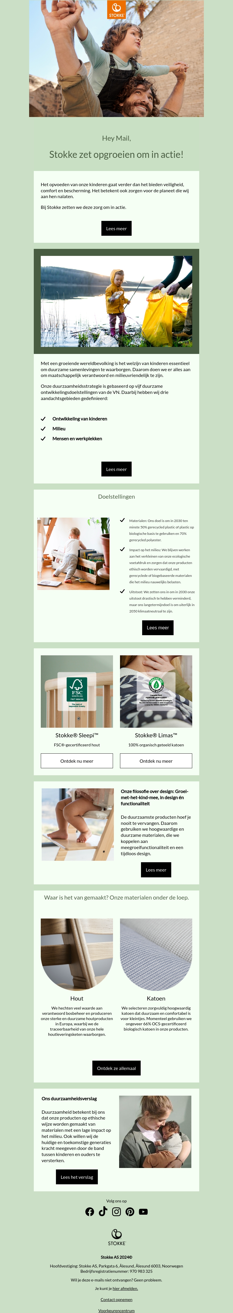 Bij Stokke staat het welzijn van kinderen en de planeet centraal. Onze duurzaamheidstrategie, gebaseerd op VN-doelstellingen, richt zich op kinderontwikkeling, milieu, en werkplekken. Ontdek duurzame materialen zoals FSC-gecertificeerd hout en katoen in onze producten.
