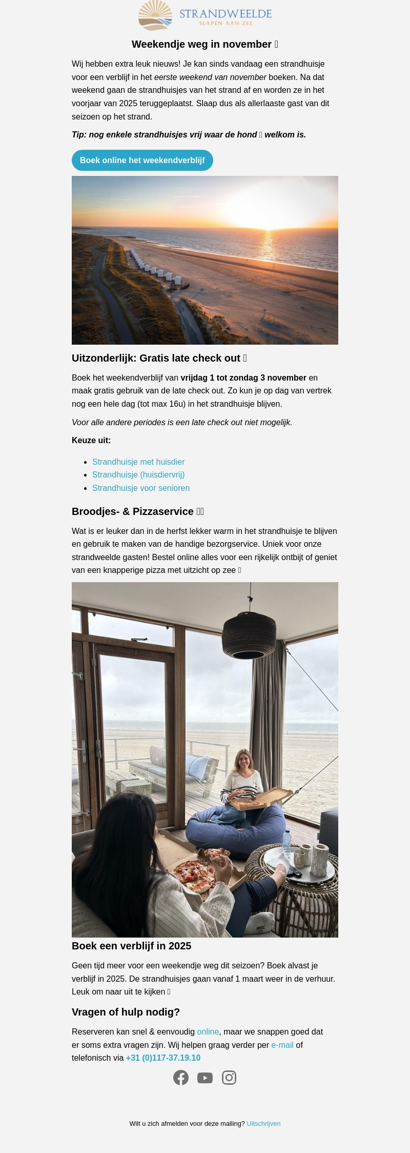Ontdek de ultieme ontspanning met een verblijf in een strandhuisje in november bij Strandweelde. Geniet van gratis late check-out van 1 tot 3 november. Bezoek met je huisdier of kies voor een huisdiervrij verblijf. Ook senioren vinden hier een perfect plekje. Maak je verblijf compleet met onze broodjes- en pizzaservice. Reserveer snel een plekje voor 2025!