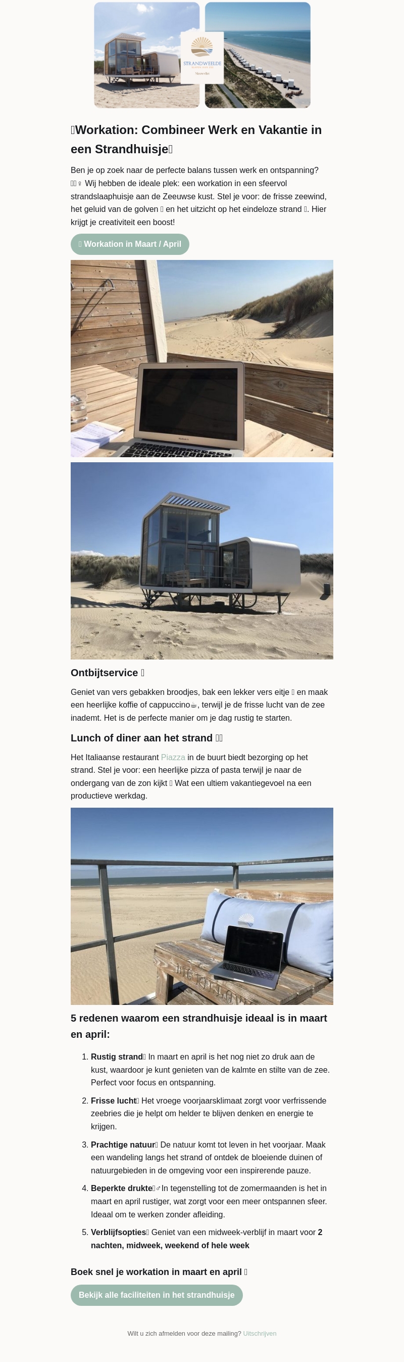 Vind de perfecte balans tussen werk en ontspanning met een workation in een sfeervol strandhuisje. Adem de frisse zeelucht in en laat je creativiteit stromen. Geniet van heerlijke maaltijden op het strand en ervaar de rust en het prachtige lenteweer in maart en april.