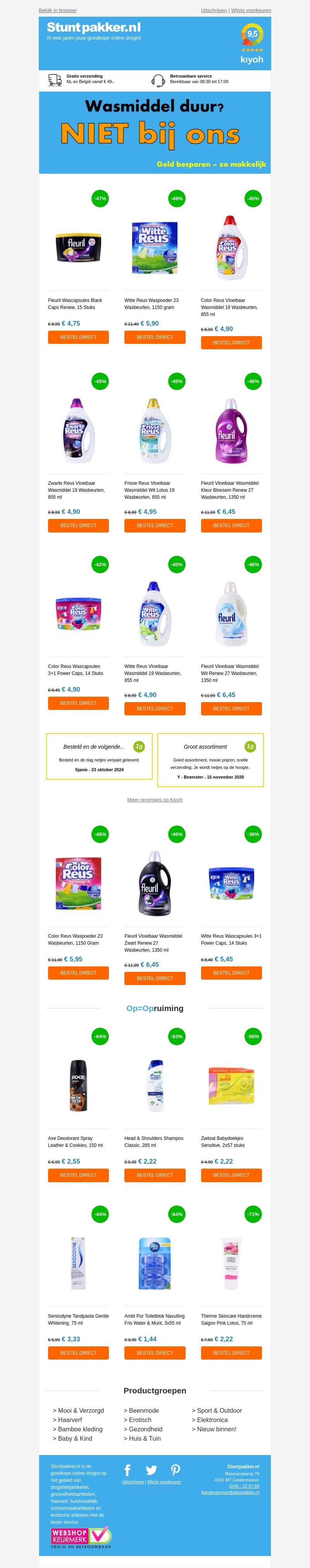 In deze nieuwsbrief ontdek je fantastische aanbiedingen voor diverse wasmiddelen. Van Fleuri tot Witte Reus, ervaar enorme kortingen tot wel 49%. Profiteer nu van de scherpe prijzen en gratis verzending bij bestellingen vanaf €40. Mis deze kans niet om te besparen!
