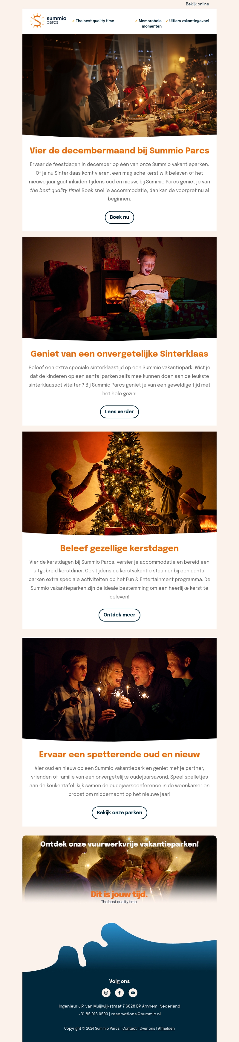 Vier de feestdagen bij Summio Parcs. Geniet van een onvergetelijke Sinterklaastijd, warme kerstdagen en een spetterend oud en nieuw. Ervaar een magische tijd met je familie in onze vakantieparken, waar speciale activiteiten voor jong en oud klaarstaan. Boek nu je verblijf en begin het nieuwe jaar goed.
