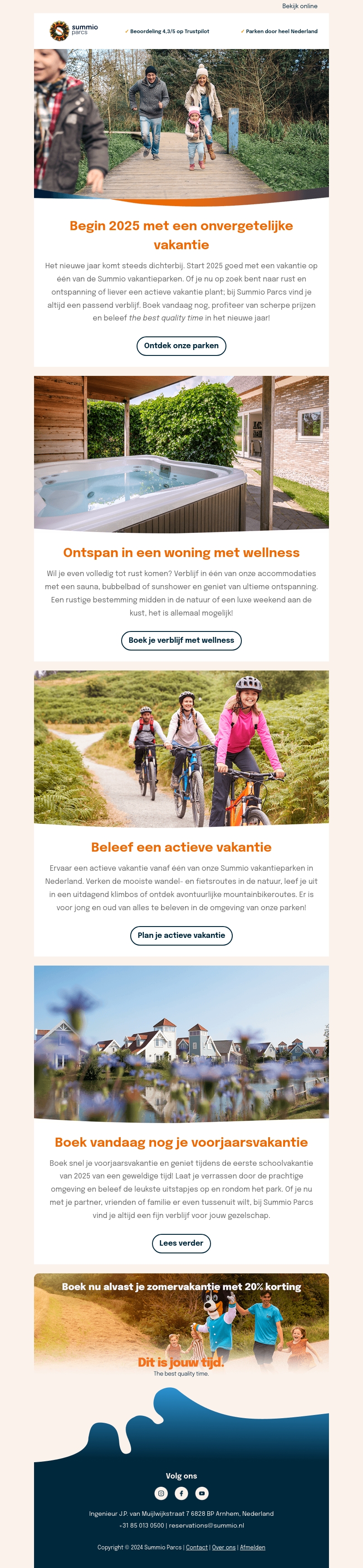 Begin 2025 goed met een unieke vakantie bij Summio Parcs. Of het nu gaat om ontspanning of avontuur, er is voor ieder wat wils. Boek een verblijf in een woning met wellness of geniet van een actieve vakantie. Reserveer jouw voorjaarsvakantie of profiteer van zomerkorting. Maak 2025 memorabel!