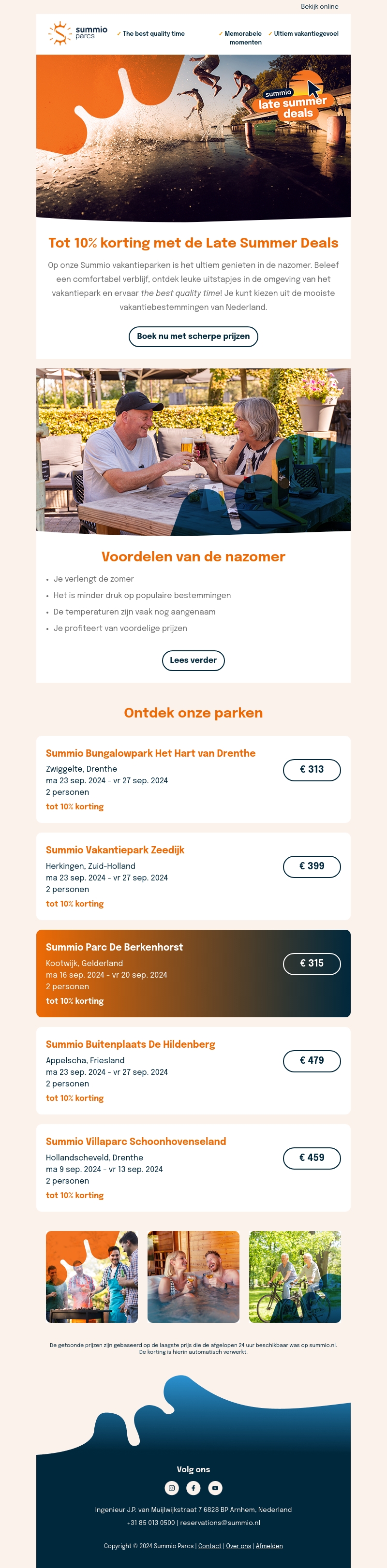Profiteer van Summio Parcs' Late Summer Deals met tot 10% korting op je verblijf. Ontdek onze prachtige parken in Nederland. Verleng de zomer met minder drukte en geniet van aangename temperaturen en voordelige prijzen.