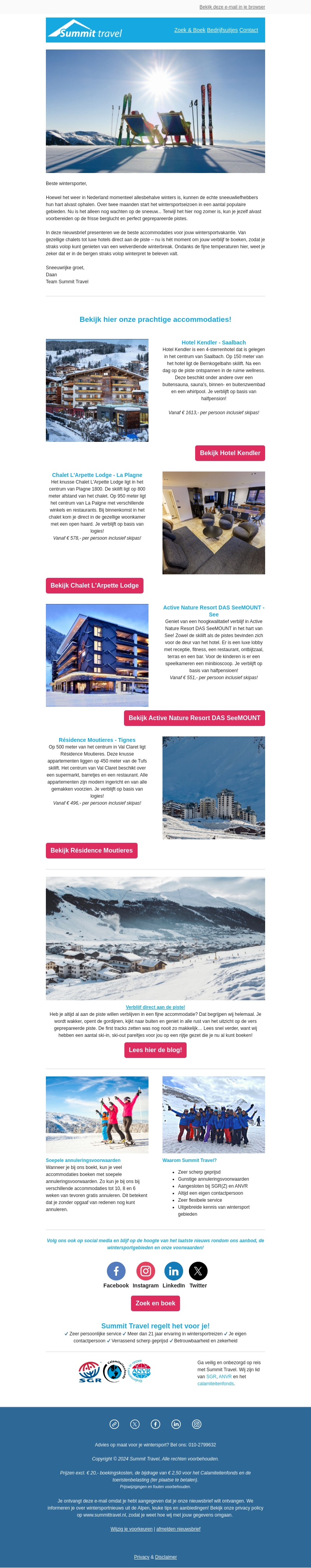 Het winterseizoen staat voor de deur en Summit Travel heeft een selectie van nieuwe accommodaties voor jou klaarstaan. Ontdek de prachtige hotels en lodges die perfect zijn voor jouw wintersportavonturen. Van Saalbach tot La Plagne en SeeMOUNT - er is voor elk wat wils. Boek nu jouw perfecte wintertrip!