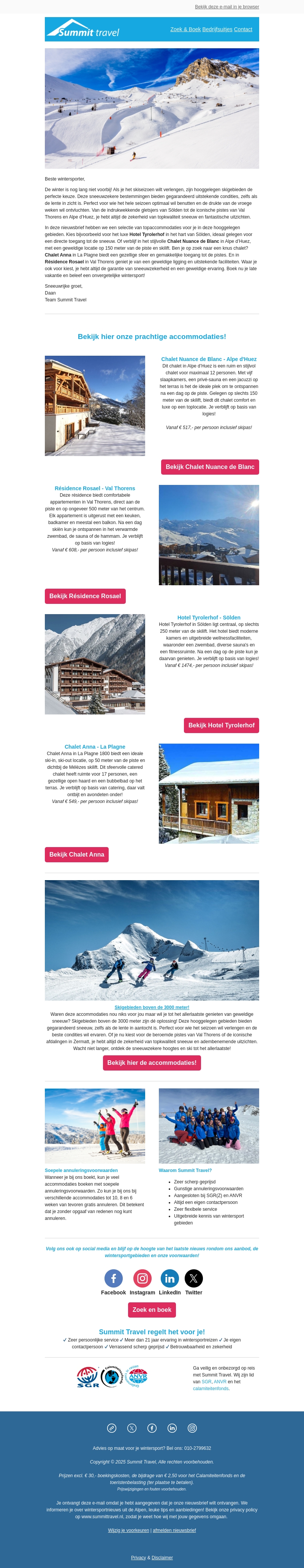 Ontdek de mooiste sneeuwzekere skigebieden met Summit Travel in maart en april. Geniet van de beste accommodaties zoals Chalet Nuance de Blanc en Residence Rosael. Boek nu en beleef een onvergetelijke wintersportervaring in top locaties zoals Alpe d’Huez en Val Thorens.