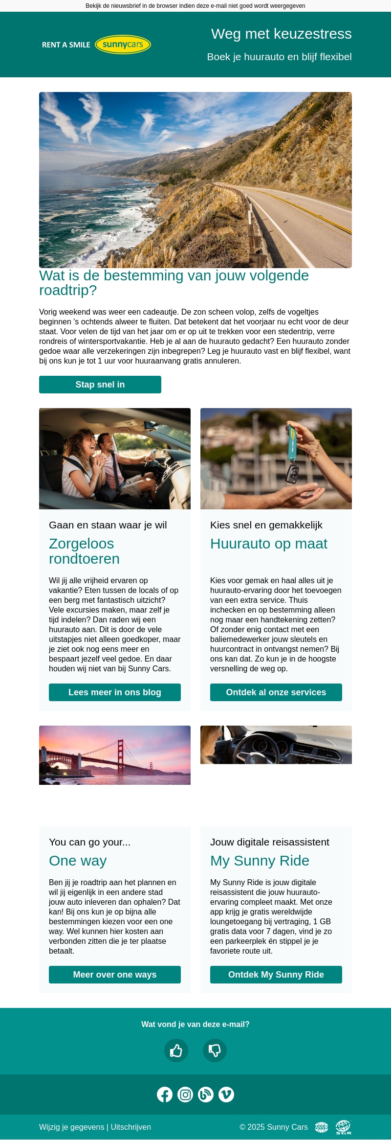 Ben je klaar voor je volgende roadtrip? Bij Sunny Cars boek je zorgeloos je huurauto met alle verzekeringen inbegrepen. Geniet van vrijheid tijdens je vakantie en kies voor gemak met onze op maat gemaakte verhuuroplossingen. Met onze My Sunny Ride-app ervaar je moeiteloos digitale ondersteuning tijdens je reis. Boek nu en profiteer van flexibele huurvoorwaarden.