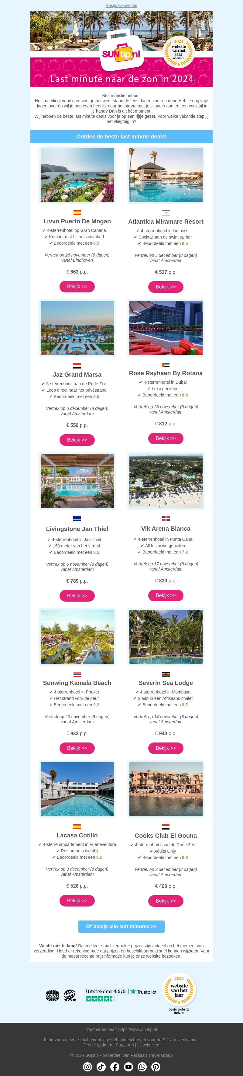 Heb je nog vrije dagen over? SUNtip.nl biedt fantastische last-minute zonvakanties voor 2024. Verken prachtige bestemmingen zoals Gran Canaria, Dubai en de Rode Zee. Boek nu en geniet van een ontspannende vakantie aan de mooiste stranden. Deze aanbiedingen zijn tijdelijk, dus grijp je kans!