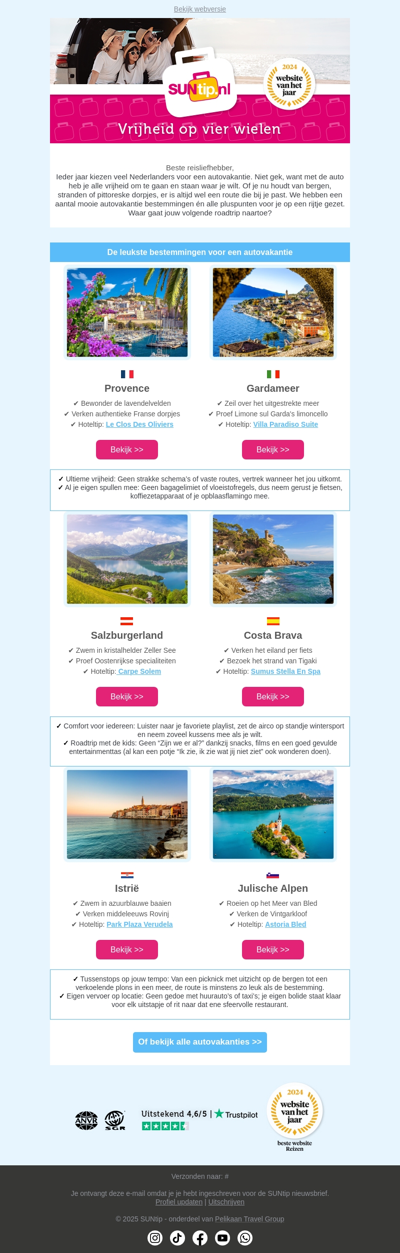 Elk jaar kiezen veel Nederlanders voor een autovakantie. Met de auto heb je de vrijheid om te gaan en staan waar je wilt. Verken bergachtige landschappen of pittoreske dorpjes terwijl je geniet van alle voordelen van een autovakantie. Ontdek prachtige bestemmingen zoals de Provence en Gardameer en maak je reis onvergetelijk.