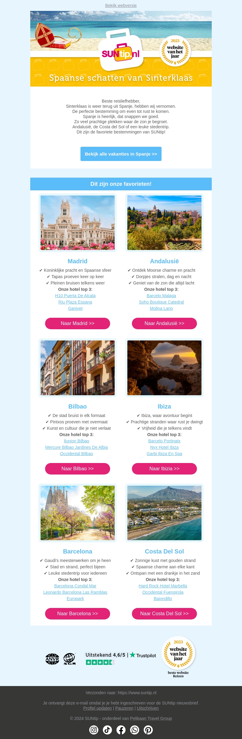 Beleef de magie van Spanje deze Sinterklaasperiode. Van het bruisende Madrid tot het ontspannen Costa Del Sol, ontdek de mooiste bestemmingen met onze exclusieve deals. Geniet van de zon, cultuur en heerlijke gastronomie in Spanje's topsteden.
