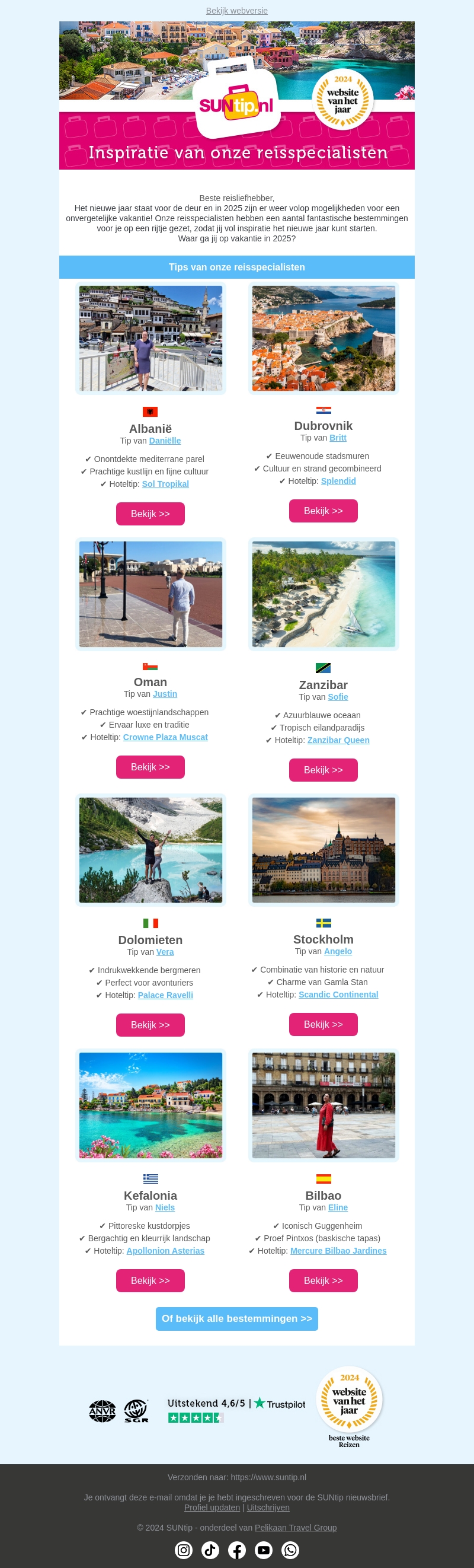 Bereid je voor op een onvergetelijke vakantie in 2025 met onze exclusieve tips van reisspecialisten. Van de onontdekte parels van Albanië tot het adembenemende uitzicht van de Dolomieten, er is voor ieder wat wils. Ontdek unieke bestemmingen zoals Oman, Zanzibar, en Stockholm. Laat je inspireren door de charme van Dubrovnik en de rijke cultuur van Bilbao. Boek jouw droomreis nu en geniet van een bijzondere ervaring.