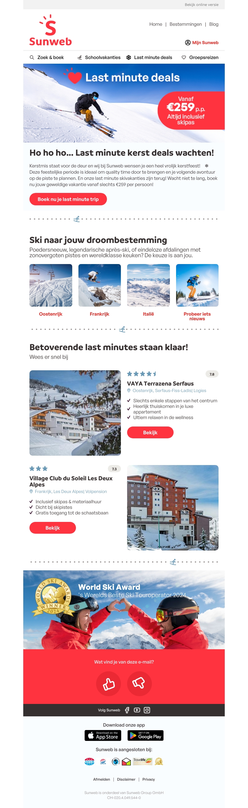 Sunweb biedt geweldige last minute skideals voor kerst aan. Profiteer van de ultieme ski-ervaring op droomlocaties zoals Oostenrijk, Frankrijk en Italië. Boek nu je ski-avontuur met kortingen die beginnen bij €259 p.p., inclusief skipas. Mis deze kans niet voor een onvergetelijke vakantie vol sneeuwpret!