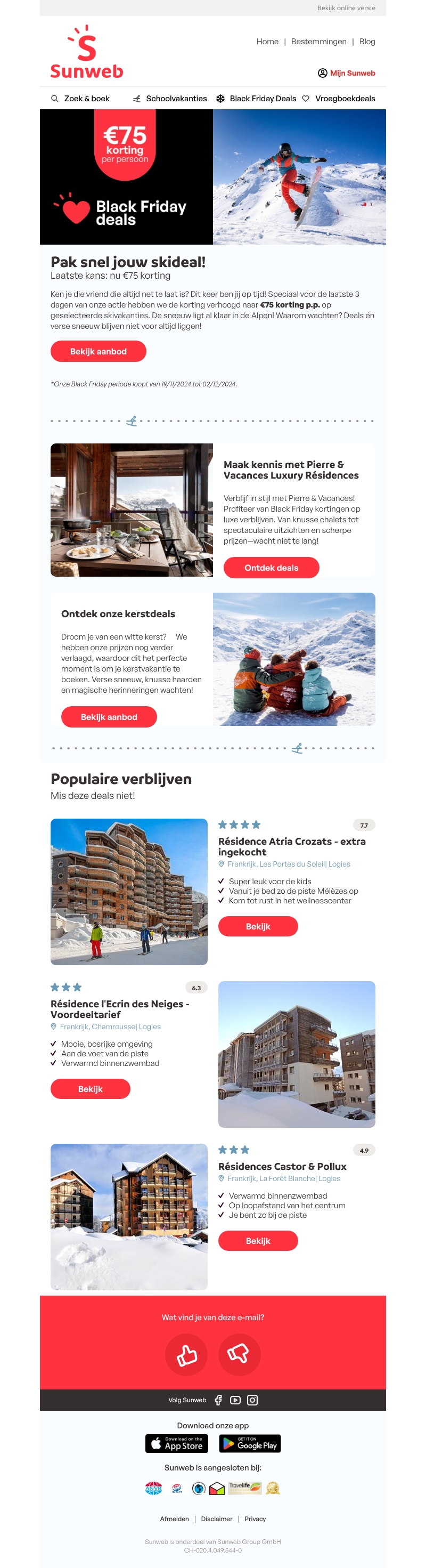De tijd dringt! Black Friday deals voor skivakanties eindigen snel, dus pak nu tot €75 korting per persoon. Boek luxe verblijven met Pierre & Vacances of ontdek onze speciale kerstdeals voor een magische winter. Wees snel en beleef een onvergetelijke vakantie.