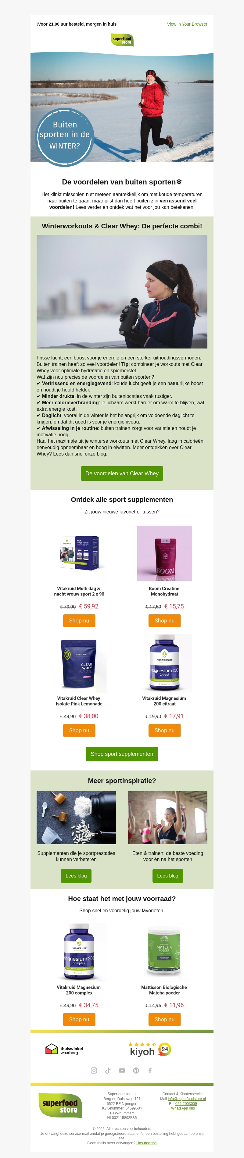 Buiten sporten in de winter kan een verfrissende en energieke ervaring zijn. In deze nieuwsbrief ontdek je de vele voordelen van winterworkouts en hoe Clear Whey je kan helpen bij jouw fitnessdoelen. Bekijk daarnaast onze selectie van sport supplementen voor een optimale training.
