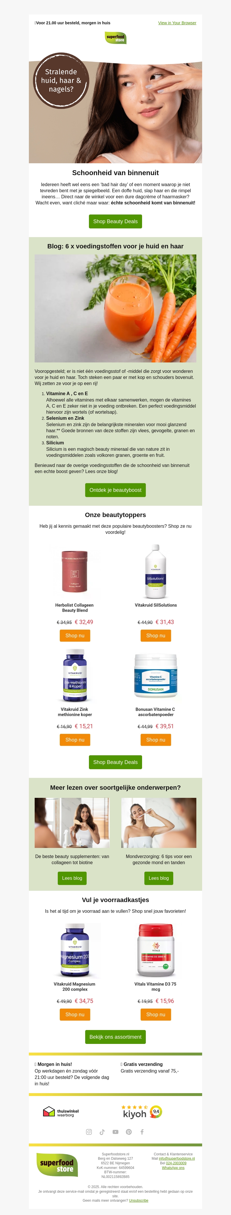 Verwen jezelf met onze geweldige beauty deals. Ontdek producten die bijdragen aan een stralende huid, haar en nagels van binnenuit. Leer meer over essentiële voedingsstoffen zoals vitamines en mineralen die wonderen kunnen verrichten. Shop nu en profiteer van kortingen op populaire producten. Bereid je voor op een stralend uiterlijk en voel je geweldig!