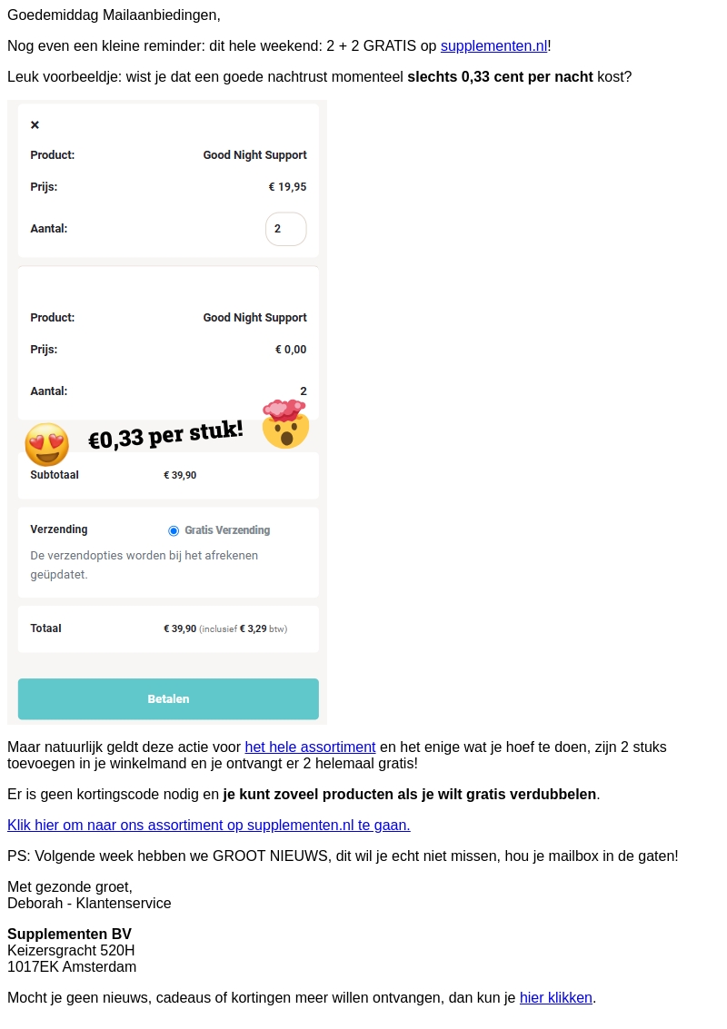 Nog slechts een paar uur om te profiteren van de 2+2 gratis actie op supplementen! Dit weekend betaal je slechts €0,33 per stuk voor een goede nachtrust. Voeg twee producten toe aan je winkelmand en ontvang er twee gratis. Geen kortingscode nodig en gratis verzending inbegrepen.