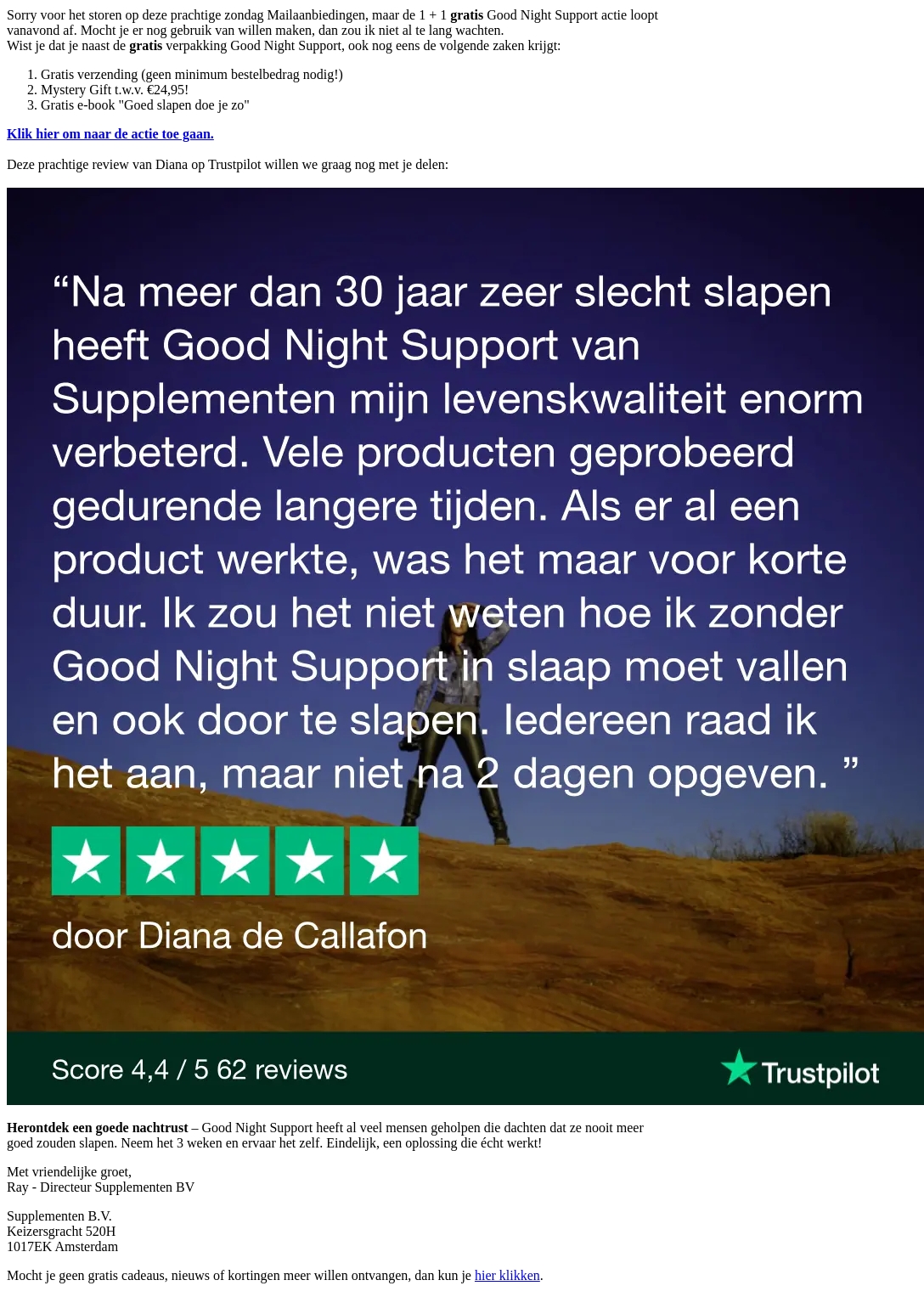 Mis deze unieke kans niet voor een betere nachtrust met Good Night Support. Vandaag is de laatste dag om te profiteren van de 1+1 gratis actie. Ontvang gratis verzending, een mystery gift en een gratis e-book over slapen. Verbeter je levenskwaliteit met vertrouwen, ondersteund door positieve klantbeoordelingen.