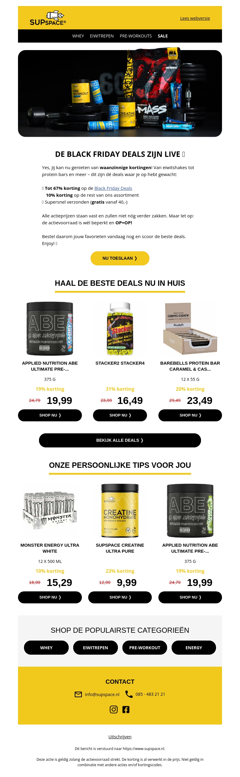 De Black Friday deals bij SUPSPACE zijn live! Geniet van kortingen tot 67% op een breed assortiment aan producten, zoals eiwitshakes en proteรฏnerepen. Wees er snel bij want op=op! Bekijk nu onze aanbiedingen en scoor je favorieten voordat het te laat is.