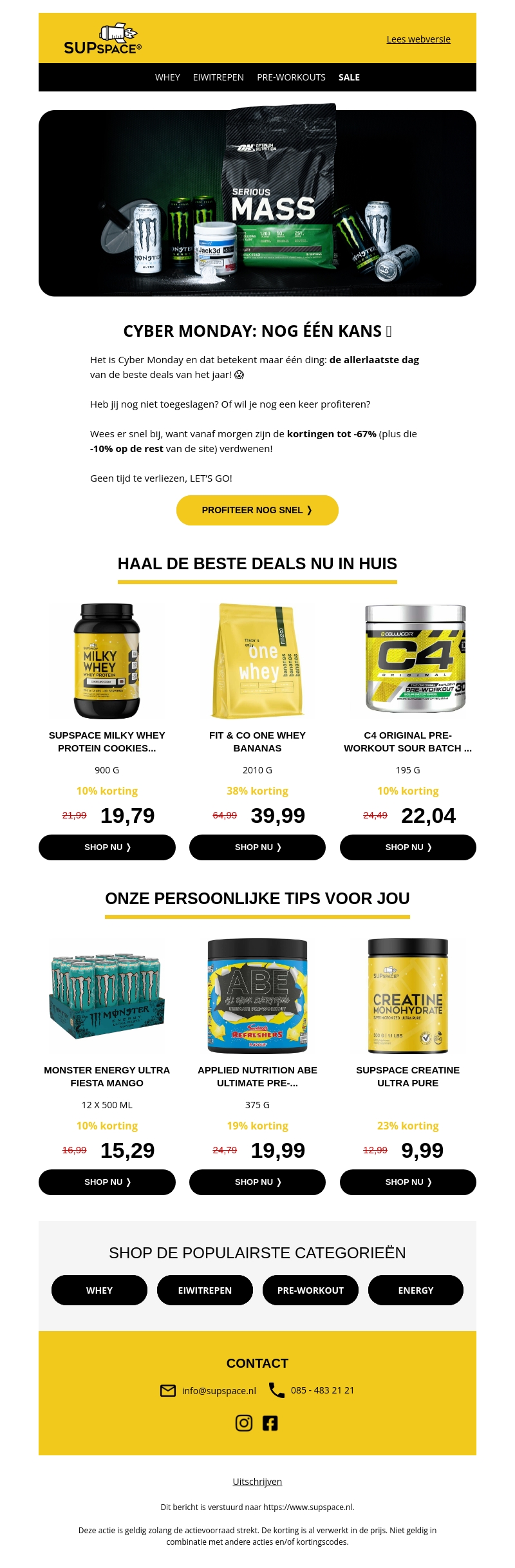 Het is Cyber Monday bij SUPSPACE, en dat betekent enorme kortingen tot 67% op jouw favoriete producten. Dit is jouw laatste kans om te profiteren van de beste deals van het jaar! Mis het niet en bekijk onze persoonlijke tips voor geweldige producten. Van eiwitrepen tot pre-workouts, er is voor elk wat wils.