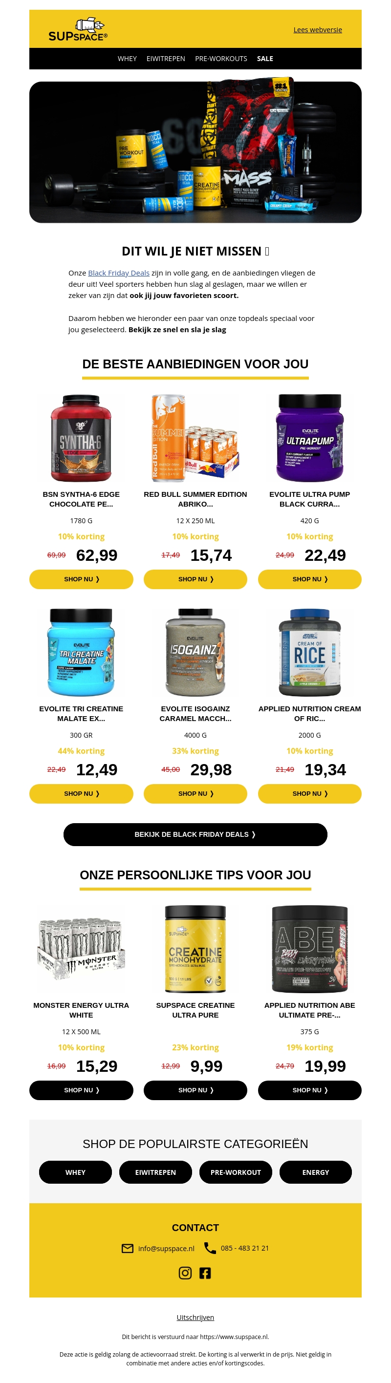 Mis deze exclusieve aanbiedingen van SUPSpace tijdens de Black Friday sales niet. Profiteer van geweldige kortingen op topproducten zoals BSN Syntha-6, Red Bull Summer Edition, en Evolite Ultra Pump. Speciale deals wachten op jou, inclusief persoonlijke aanbevelingen en topcategorieรซn. Bezoek onze webshop en scoor jouw favorieten vandaag nog.