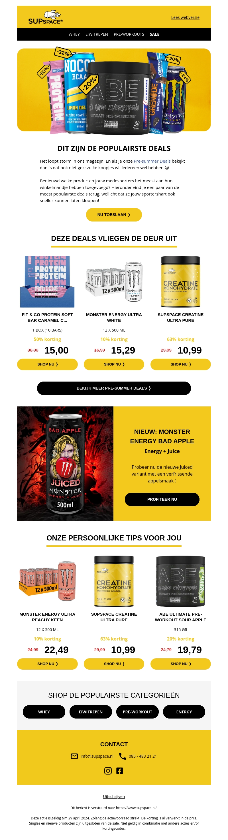 Het gaat hard met de vakantiegeld-deals bij SUPSPACE! Snelle beslissers profiteren van scherpe kortingen op whey proteรฏne, eiwitrepen, en energiedrankjes. Ontdek populaire producten zoals ABE Ultimate Pre-Workout en Monster Energy. Mis de kans niet om voordelig te shoppen.
